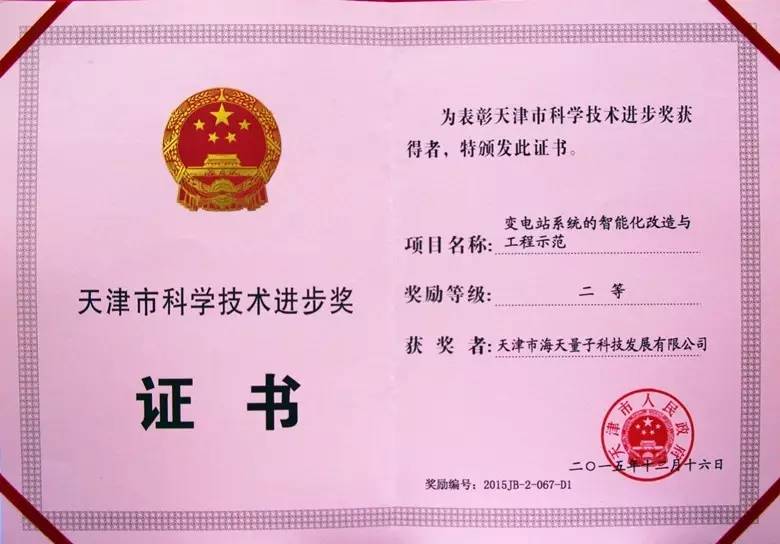 2015年度,天津市共有199项科技成果获奖,其中由我集团下属全资子公司“天津市海天量子科技发展有限公司”申报的《变电站系统的智能化改造与工程示范》项目喜获天津市科学技术进步二等奖滨海新区科学技术进步一等奖